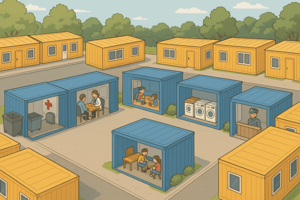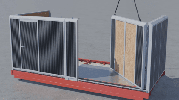 ‘접이식 모듈러 시스템’은 3가지를 모두 충족해. 접었을 때 부피가 3분의 1로 줄거든? 컨테이너형 주택 1개를 옮길 차량으로 이런 주거시설 3개를 옮길 수 있지. 보관도 쉽고, 설치도 신속하게!