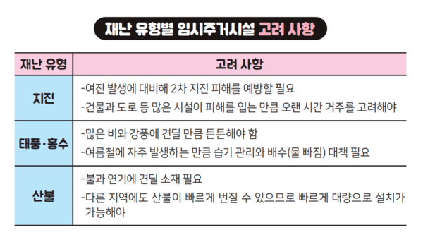 챗GPT: 훌륭한 지적! 재난 유형에 따라 임시주택을 만들 때 고려할 사항이 조금씩 다르겠지? 자, 정리왕 출동!