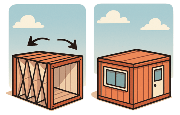 컨테이너형 주택은 누워있는 형태의 *직육면체잖아. 여기서 앞면과 뒷면은 나중에 조립해 끼워 넣고, 두 옆면이 주택 안쪽을 향해 절반으로 딱 접히는 방식이지. 접힌 채로 보관하다가 윗면을 들어 올리면 옆면이 자연스레 펼쳐지며 구조가 완성! 4개면이 비로소 마주보게 되면 출입문 역할을 하는 앞면과 뒷면을 조립해 직육면체 형태를 갖추는 거지.