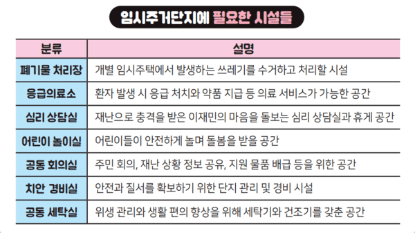 정리왕인 이 몸이 또 나설 차례인가? 수도와 전기 시설은 각 임시주택 내부에 마련돼 있을 테니까, 추가적으로 다음 시설들이 필요할 거야