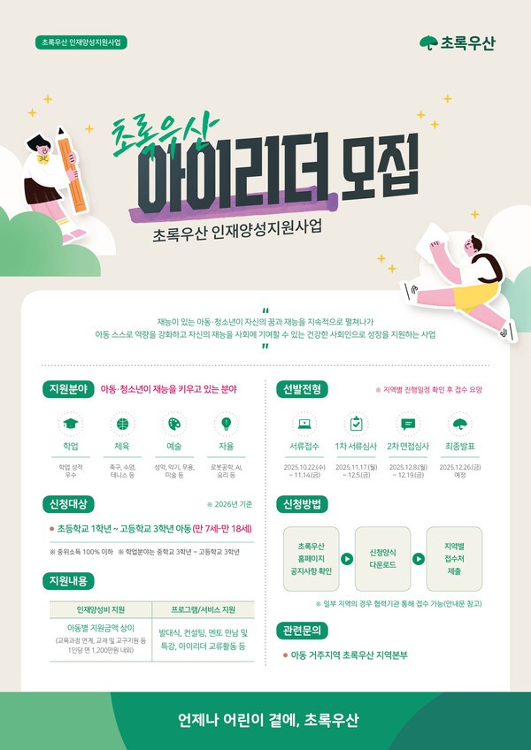 아동복지전문기관 초록우산(회장 황영기)이 오는 11월 14일까지 ‘2026년 초록우산 아이리더’를 신규 모집한다.
