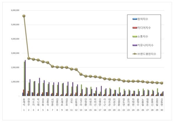 5위, 강호동 브랜드는 참여지수 137,320 미디어지수 250,263 소통지수 914,032 커뮤니티지수 1,110,329가 되면서 브랜드평판지수 2,411,944로 분석됐다. 지난 10월 브랜드평판지수 3,653,096과 비교해보면 33.98% 하락했다.