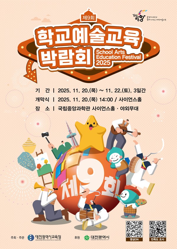 대전시교육청은 11월 20일부터 22일까지 「2025 제9회 학교예술교육박람회」를 국립중앙과학관에서 개최한다고 밝혔다.
