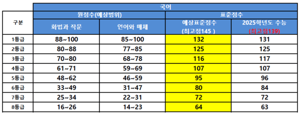 진학사의 분석에 따르면, 국어영역의 경우 원점수 기준 1등급컷은 ‘화법과 작문’이 88~100점, ‘언어와 매체’가 85~100점으로 예상된다. 표준점수 기준 1등급컷은 132점으로, 표준점수 최고점은 145점으로 예상했다. 지난해 국어영역 표준점수 최고점은 139점이었다.