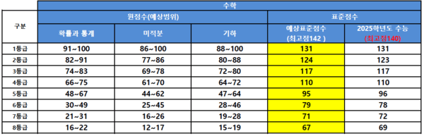 수학영역의 경우 원점수 기준 1등급컷은 ‘확률과 통계’가 91~100점, ‘미적분’이 86~100점, ‘기하’가 88~100점으로 예상된다. 표준점수 기준 1등급컷은 131점으로 표준점수 최고점은 142점으로 예상했다. 지난해 국어영역 표준점수 최고점은 140점이었다.