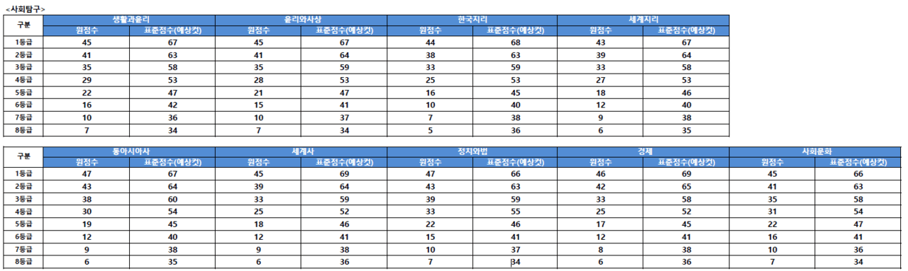 입시업체 진학사가 14일(금) 오전 9시 기준 2026학년도 수능 주요 영역의 원점수 및 표준점수 기준 예상 등급컷을 공개했다. 진학닷컴 가채점 성적 입력자의 표집 데이터를 토대로 산출한 것으로, 원점수는 예상 범위를 추정한 것으로, 표준점수는 예상 커트라인 기준이다.