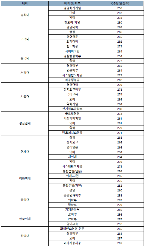 고려대의 정시 합격선은 △경영대학 268점 △행정 266점 △영어영문 265점 △의과대학 292점 △반도체공학 273점 △사이버국방 264점 등으로 예상했다.