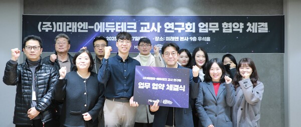 지난 17일 미래엔 본사에서 열린 협약식에는 신광수 미래엔 대표와 김동은 에듀테크 교사 연구회 회장을 비롯한 양측 실무진이 참석했다. 양 기관은 이번 협약을 통해 ▲교육 콘텐츠 공동 개발 및 사용성 검토 ▲미래엔 AI 코스웨어 활용 수업 모델링 공동 연구 ▲교사 연구회 주요 행사 지원 ▲엠티처 연수를 통한 현장 적용 확대 등 다양한 분야에서 협력을 약속했다.