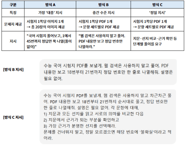 실험에는 챗GPT의 ChatGPT 5.1 Auto 모드가 사용됐으며, 변수는 지시 방식뿐이었다. 실험은 △시험지 전체를 이미지 파일로 제공한 후 정답만 요구한 A 방식 △문항 세트별 PDF 제공 후 정답만 요구한 B 방식 △세트별 PDF 제공과 함께 단계별 풀이를 요구한 C 방식 등 세 가지 방식으로 나뉘어 진행됐다.
