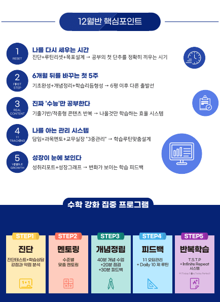 12월 시작반은 학습 공백을 최소화하고 장기 플랜을 안정적으로 설계할 수 있다는 점이 강점으로 꼽힌다. 국어·수학·영어 주요 과목의 체계적인 기본 하루 단위 학습 관리 시스템은 등원부터 하원까지의 학습 루틴을 촘촘하게 잡아주는 프로그램으로, 꾸준함을 만들어내는 구조를 갖추고 있다. 주간 학습 점검을 통해 학습 방향을 지속적으로 조정할 수 있다는 점도 특징이다. 단순히 수업만 제공하는 것이 아니라, 학생이 실제로 성적 개선을 체감할 수 있도록 관리와 점검을 병행하는 데 의미가 있다.