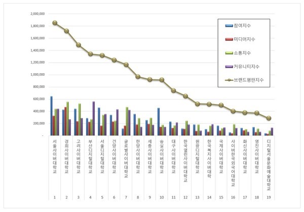 2025년 11월 사이버대학교 브랜드평판 순위는 서울사이버대학교, 경희사이버대학교, 고려사이버대학교, 부산디지털대학교, 서울디지털대학교, 건양사이버대학교, 글로벌사이버대학교, 한양사이버대학교, 세종사이버대학교, 숭실사이버대학교, 대구사이버대학교, 한국열린사이버대학교, 원광디지털대학교, 한국복지사이버대학, 국제사이버대학교, 사이버한국외국어대학교, 화신사이버대학교, 영진사이버대학교, 디지털서울문화예술대학교 순으로 분석됐다.